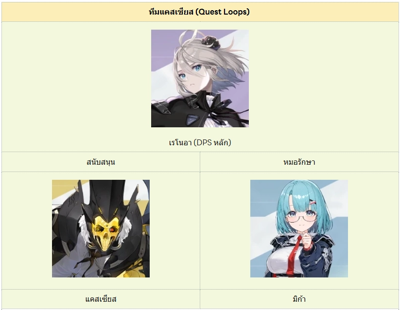 ทางเลือก: คุณสามารถแทนที่ Renoa ด้วย ตัวละครโจมตีแรงสูง (Combatant) ที่มีการ์ดใช้ค่า AP ต่ำก็ได้ เซ็ตนี้เน้นไปที่ การสร้าง AP ของ Mika เพื่อให้ทีมสามารถเล่นการ์ดได้มากขึ้น ในสถานการณ์ที่สมบูรณ์แบบ เกมจะง่ายขึ้นมากถ้า Cassius จั่วการ์ด Quest: Fullhouse